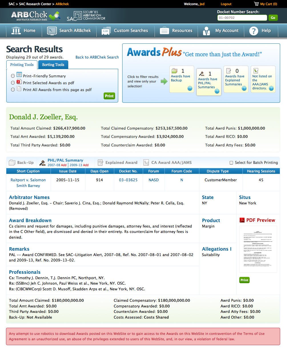 ARBchek is the most powerful search tool for securities arbitration research available. With ARBchek, you may search 55,000+ Award records, viewing the results in summarized, easy-to-read chart formats.